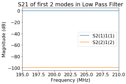 This past week I've been looking at the radio frequency power supply line of the 200 MHz cavities. Specifically, the part of the line right before entering the cavity that acts as a low pass filter. It's purpose is to keep components of the electromagnetic field that aren't oscillating at 200 MHz from entering the cavity.