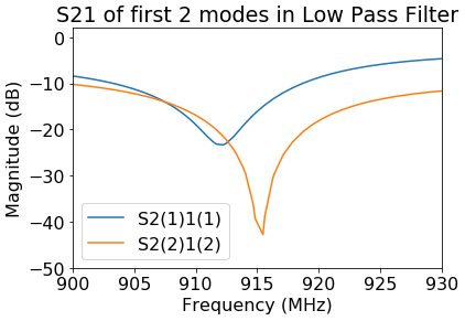 And here's an S-parameter plot of the transmission into the cavity at 915 MHz. -40 dB corresponds to about only 0.01% of the field making it through, which is quite good.