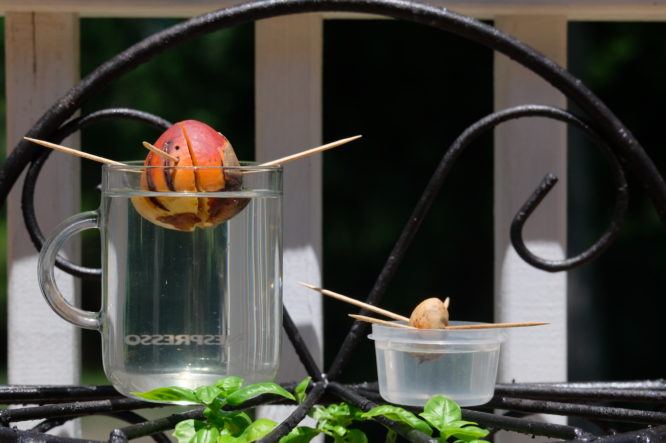 The avocado is not doing well. Luna thinks it's really fun to drink out of it from the railing, and most mornings we find it on the ground.