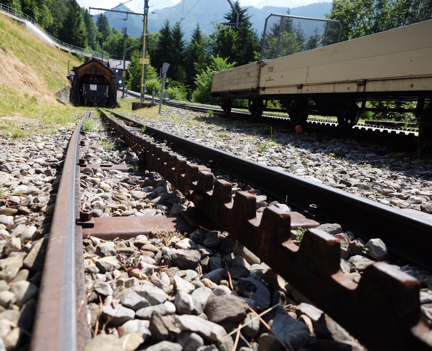 The cogwheel train is for going up mountains. It's got teethlike tracks and a mechanism that locks the train in place just in case something goes wrong.